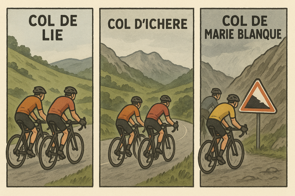Heute, nach der Anstrengung gestern und den Prognosen von Meteo France vorsichtig geplant: ‚Lockere‘ 63 km und 1650 Hm. Geplant haben wir präziese: ab 15.00 sollte Regen einsetzten und ab 15.00 Checkin im Hotel. Auf Meteo France ist verlass: Leichter Regen ab 14.30. Richtig Schüttet es ab 15.00. Auf uns ist auch verlass: im Hotel 14.45. Aufs Hotel weniger, Checkin erst ab 16.00 obwohl im Netz 15.00 angegeben ist. Glück im Unglück das Hotel hat auch eine Beiz und so gibts das Bier (und das bloggen) halt schon vor dem Duschen. Die heutigen Pässe: Col de Lie, Col d’Ichere und zum happigen Dessert den Col de Marie Blanque, der uns mit seinen über Kilometer Konstanten 11, 12 und 13% doch extrem forderte. Zum Glück waren wir geistreich genug im letzte Cafe noch ein Sandwiches mit auf den Weg zu nehmen um oben wieder zu Kräften zu kommen. Es waren nicht die hohen Pässe (dafür die steilen) und die saftig grünen Hügel mit Schafen, Pferden und Kühen aller Couleur könnten auch in Irland oder England stehen. Das inzwischen wieder nasskalte Wetter dazu wäre auch grad passend.