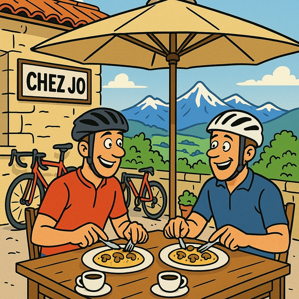 Nach einem tollen Cyclist- Znacht mit extra viel Reis (féculants) und bestem Frühstück mit eigenen Gartenfrüchten, hausgemachtem Yogurth und Konfi durften wir nur kurz einfahren, bevor es in die 8-11% Rampen des Col de Menté ging. Nicht lange am Berg und das Frühstück machte sich bei mir wieder bemerkbar. In Kombination mit den Anstrengungen der letzten Tage sind solche langen steilen Rampen nicht zu empfehlen. Schon bald merkte ich, dass heute kein guter Tag mit lockerem Pedalen werden würde, sondern eine Quäldich-Etappe auf dem Programm stand. Der Col de Menté hiess schon bald Sauhund (1), nur um anschliessend vom noch etwas steileren Sauhund 2 (Col de Portet d’Aspet) abgelöst zu werden. Laut Planung standen dann nur noch 2 kleinere weniger steile Pässe (Col de Portech und Col de Catchaudégué) an, also lassen wir uns die Omlette mit frisch Steinpilzen zum Zmittag bei Chez Jo (trotz noch immer etwas rumorendem Magen – und den Kaffe hat ChatGPT selber dazugedichtet genauso wie der fehlende Lenker, der wurde nicht gestohlen, sondern ist bei Rüfi nur etwas verbogen) nicht entgehen, zumal wir zahlreiche sonntägliche Pilzsammer entlang der Passtrassen angetroffen hatten.